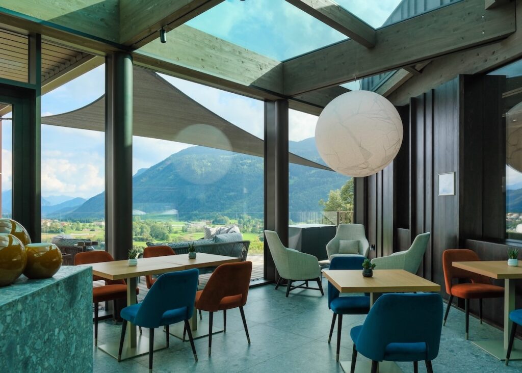 L’identità del relais si fonda su un equilibrio tra design contemporaneo e paesaggio alpino, con ampie vetrate che mettono costantemente in dialogo interno ed esterno.